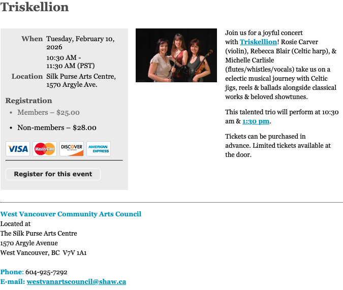 Our lovely trio of ladies will be putting on two concerts at the amazing Silk Purse Art Gallery in West Vancouver (1570 Argyle Ave.), on Tuesday, February 10th, 2026. Choose from the 10:30-11:30 am show or the 1:30-2:30 pm option. While you’re there, enjoy the art and the incredible view of the ocean and Stanley Park across the water. Our music will, as always, include Celtic and Classical, with some world music and more. (www.Triskellion.ca www.Facebook.com/TriskellionVancouver)