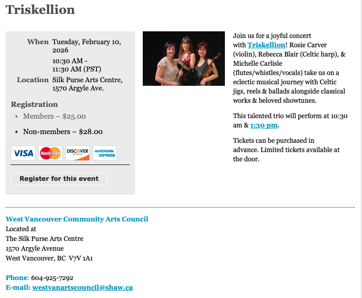 UPCOMING PERFORMANCE:Tuesday, February 10, 2026 – West Vancouver’s Silk PursePerformances at both 10:30 am AND 1:30 pm. Register for your choice at: Phone: 604-925-7292 E-mail: westvanartscouncil@shaw.ca